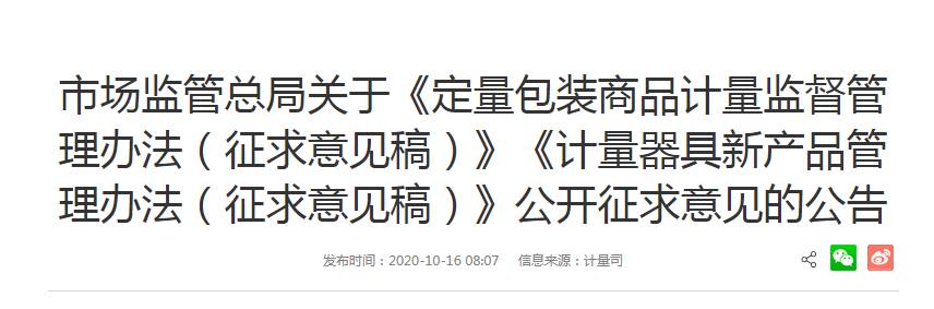 近日,市場監管總局發布《計量器具新產品管理辦法(征求意見稿)》,向社會公開征求意見,反饋截止日期為2020年11月16日。