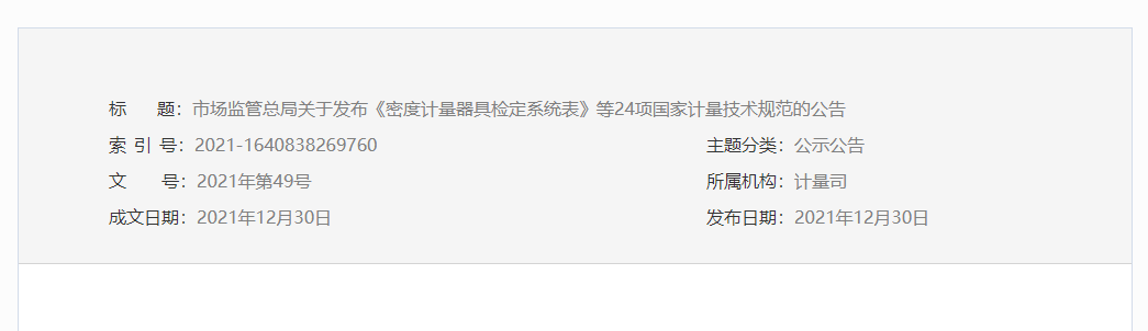 近日,市場監(jiān)管總局關(guān)于發(fā)布《密度計量器具檢定系統(tǒng)表》等24項國家計量技術(shù)規(guī)范的公告: