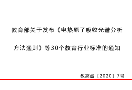 10月9日,教育部辦公廳印發“教育部關于發布《電熱原子吸收光譜分析 方法通則》等30個教育行業標準的通知 ”(下稱“通知”)。通知表示,經全國教育裝備標準化技術委員會審查通過,現發布 30個教育行業標準,并將自2020年12月1日起實施。
