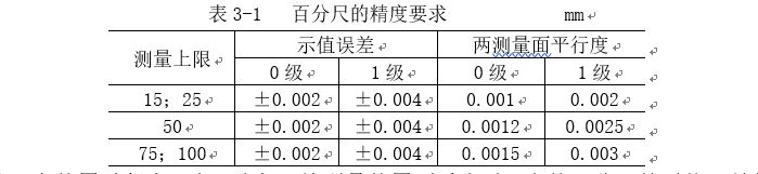 百分尺是一種應用很廣的精密量具,按它的制造精度,可分0級和1級的兩種,0級精度較高,1級次之。百分尺的制造精度,主要由它的示值誤差和測砧面的平面平行度公差的大小來決定,小尺寸百分尺的精度要求,見表3-1。從百分尺的精度要求可知,用百分尺測量IT6~IT10級精度的零件尺寸較為合適。